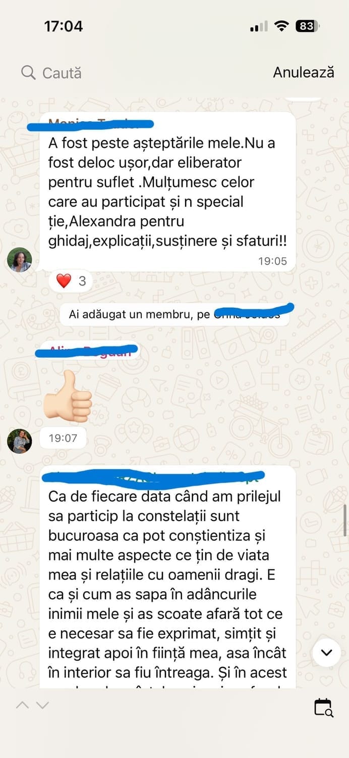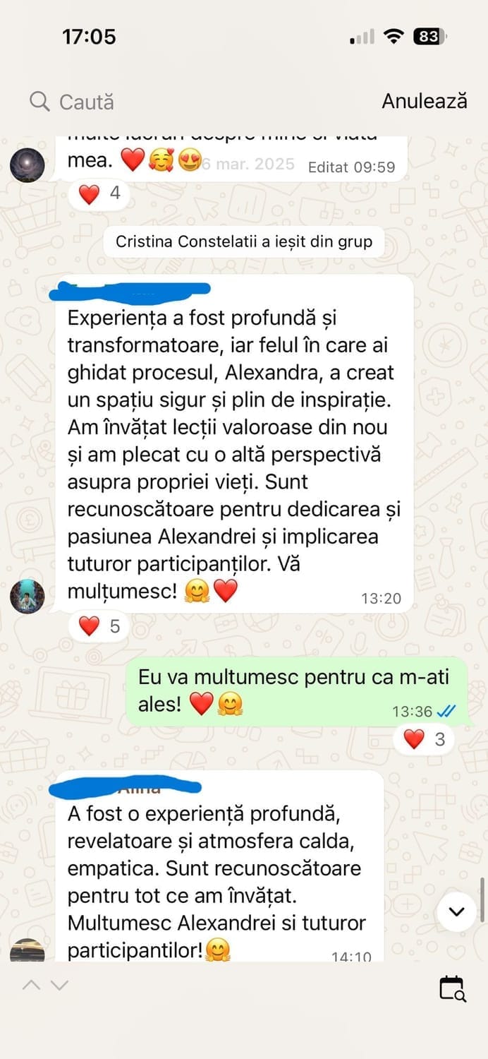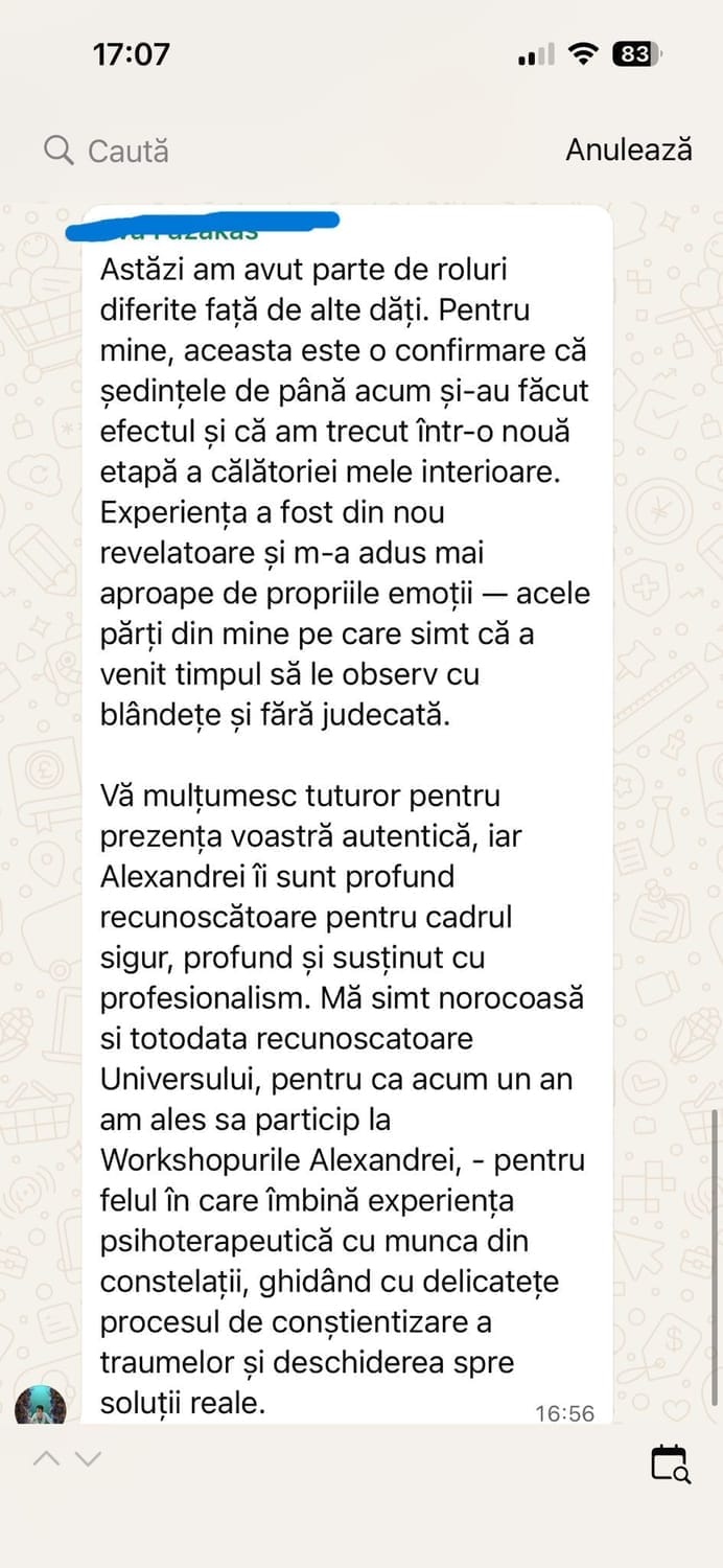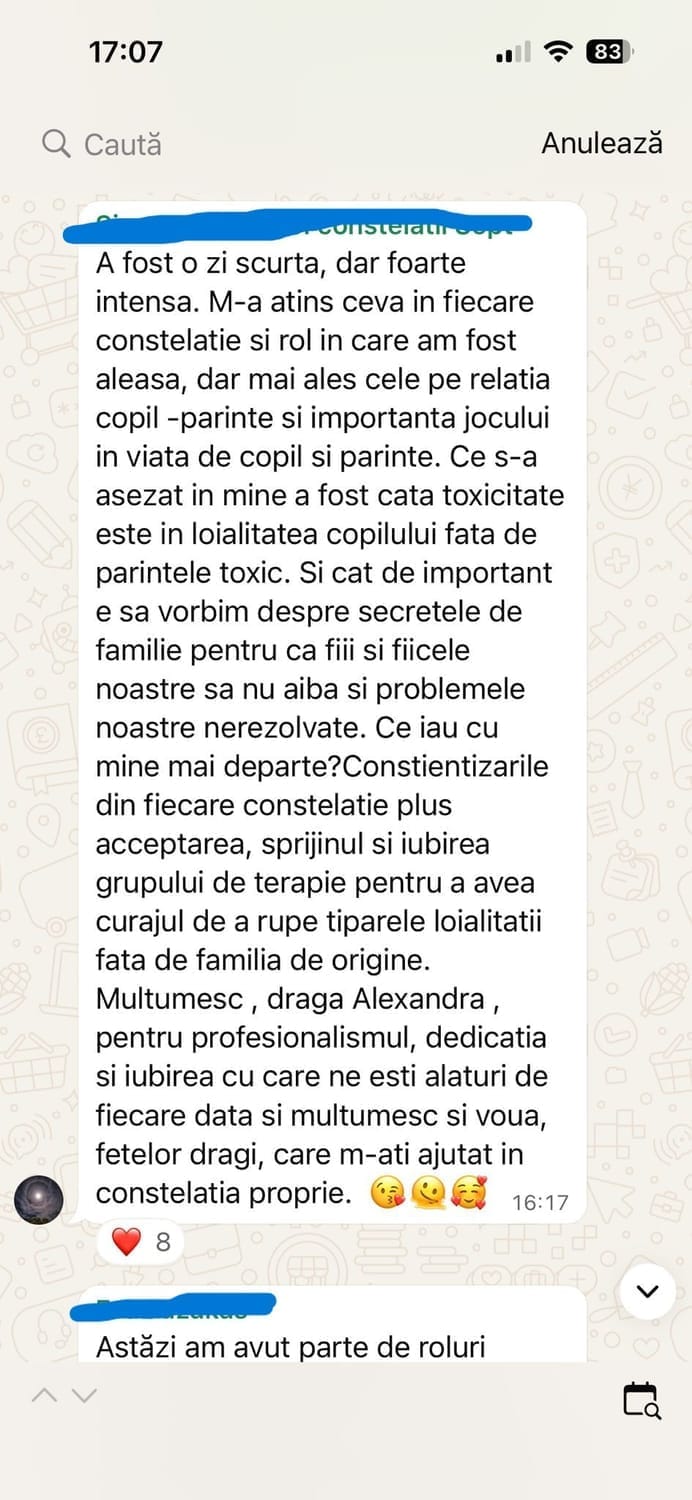 Câte un workshop de terapie de grup pe săptămână (neurografică, constelații, alte practici integrative)